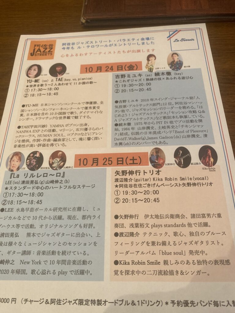 ジャズストリートバライティー会場ビストロルテロワール阿佐ヶ谷も参加いたします。席の方は、まだあります。